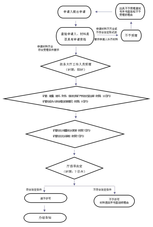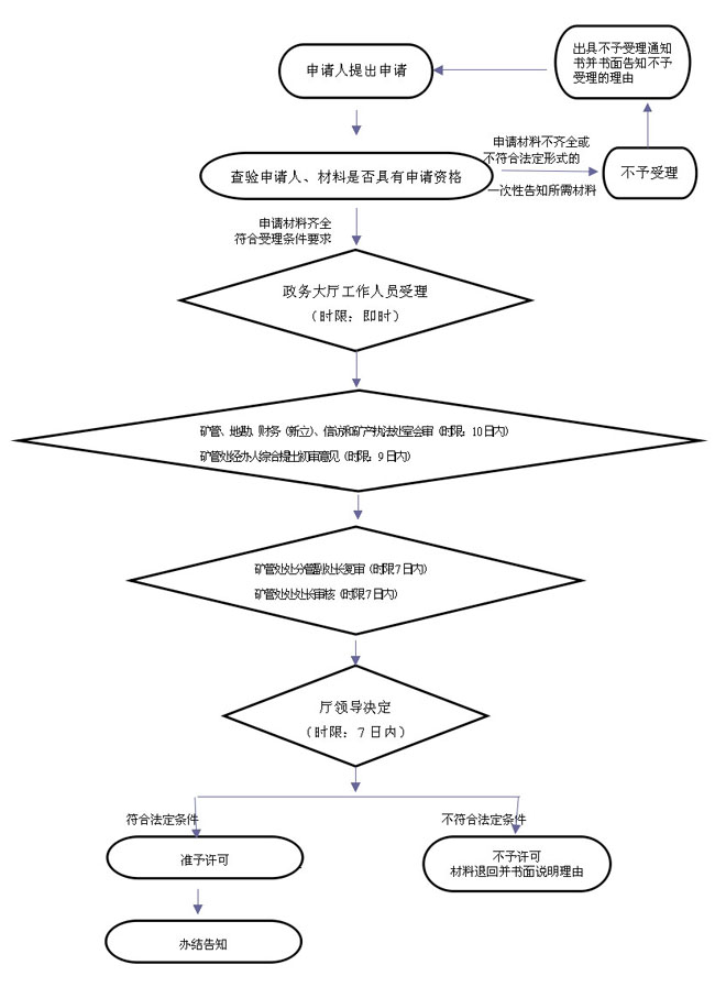 ②礦管處處長對經復審后的申辦材料進行審核。對符合條件的申辦材料,提出同意的審核意見,報分管廳領導決定;對不符合條件的申辦資料,提出不同意的審核意見,報分管廳領導決定。(7個工作日)
