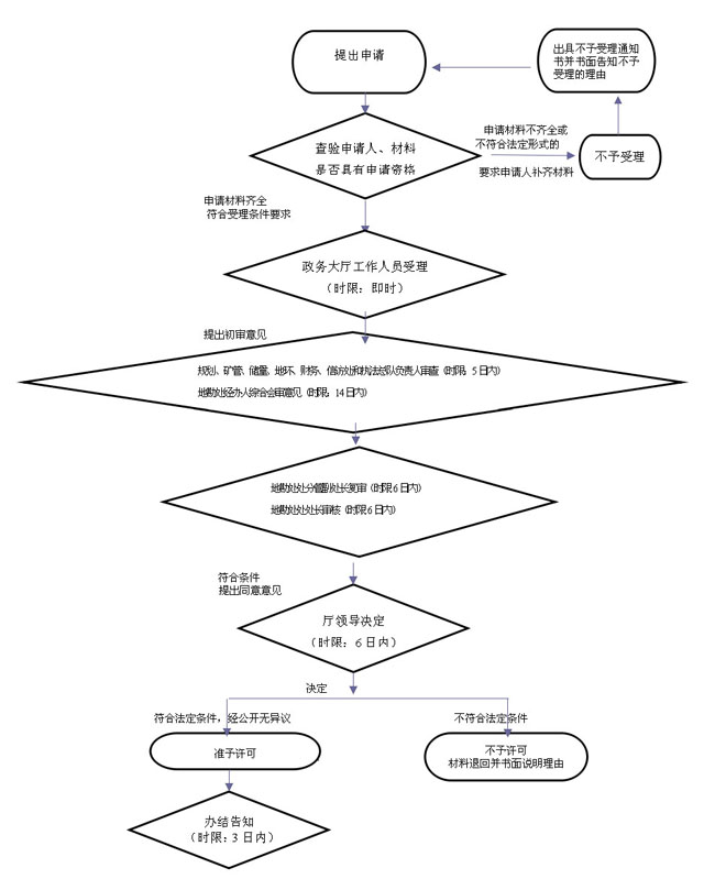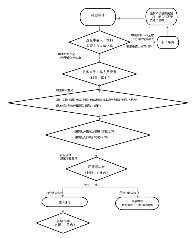 ①規劃、礦管、儲量、地環、財務、信訪處和執法總隊負責人按照審批條件及標準,對申辦材料進行審查;(5個工作日)