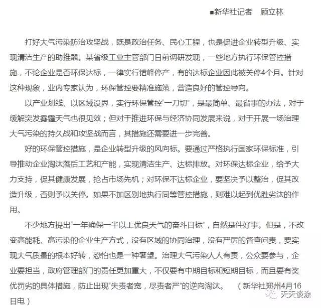 新華社文章認為:以產業(yè)劃線、以區(qū)域設界,實行環(huán)保管控“一刀切”,是最簡單、最省事的辦法,對于緩解突發(fā)霧霾天氣也很見效。但對于推進環(huán)保與經濟協同發(fā)展來說,對于開展一場治理大氣污染的持久戰(zhàn)和攻堅戰(zhàn)而言,其措施還需要進一步完善。
