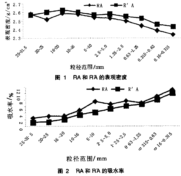 李秋義等[7]對再生骨料整形前后的性能指標(biāo)進(jìn)行了對比試驗,試驗結(jié)果表明,在5~31.5mm的粒徑范圍內(nèi),經(jīng)顆粒整形后所得的再生粗骨料(下文簡寫為R'A)表觀密度比整形前提高約1.17%(見圖1)[7],空隙率降低約9%,吸水率和壓碎指標(biāo)都大幅降低,粗骨料的外觀也得到明顯的改善。再生骨料的吸水率隨骨料粒徑的減小而上升;RA的吸水率高于R'A吸水率,這個差異在粗骨料中更為明顯(見圖2) 。因此,要提高再生骨料性能,對RA進(jìn)行整形強化很有必要。