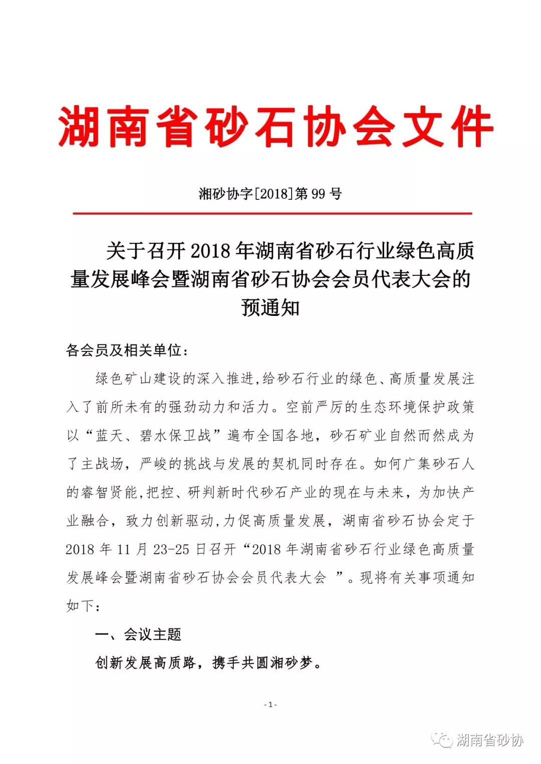 關于召開2018年湖南省砂石行業綠色高質量發展峰會暨湖南省砂石協會會員代表大會的預通知