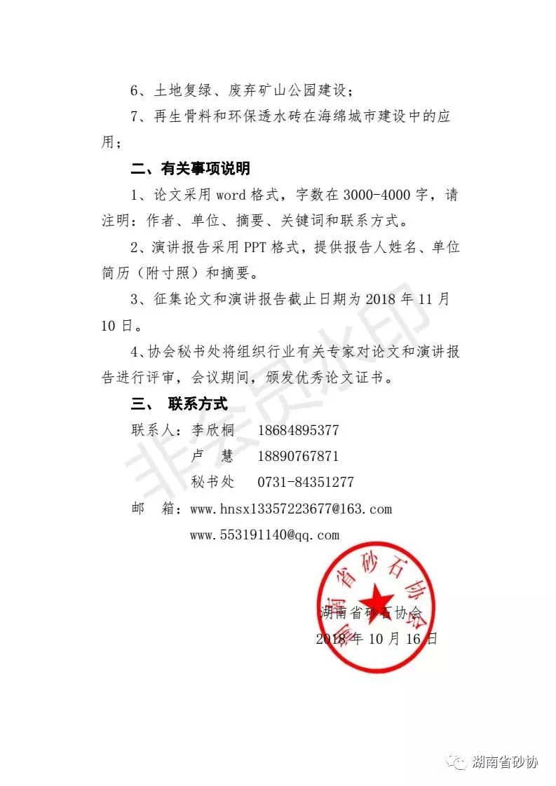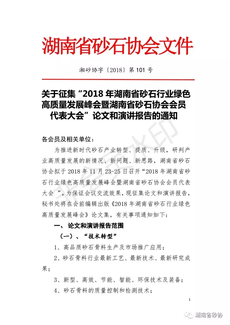 關(guān)于征集“2018年湖南省砂石行業(yè)綠色 高質(zhì)量發(fā)展峰會(huì)暨湖南省砂石協(xié)會(huì)會(huì)員 代表大會(huì)”論文和演講報(bào)告的通知 發(fā)布日期:2018-10-16 07:23:24 點(diǎn)擊量:1 標(biāo)簽:通知公告