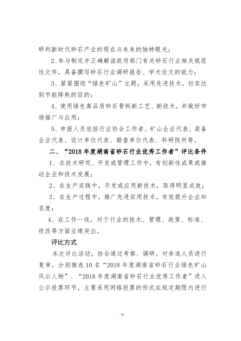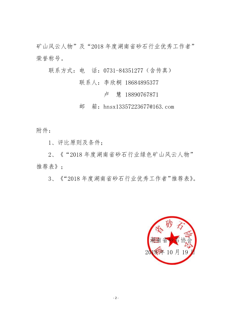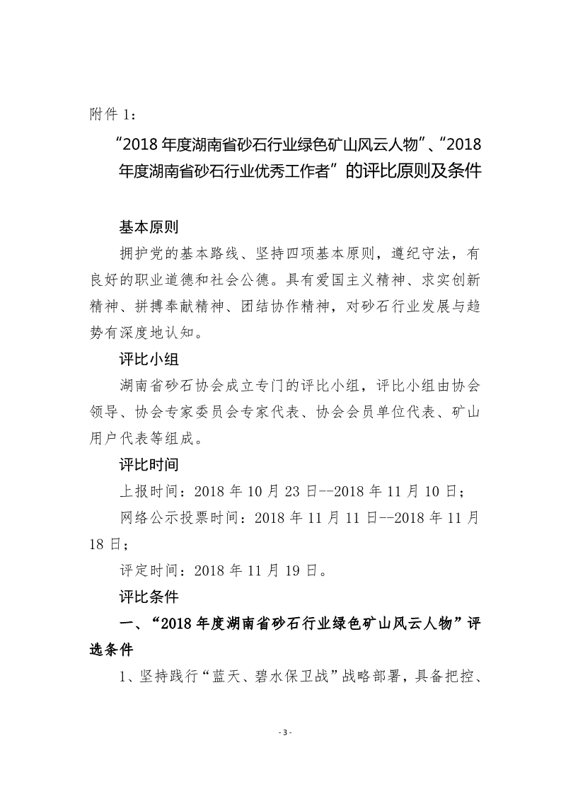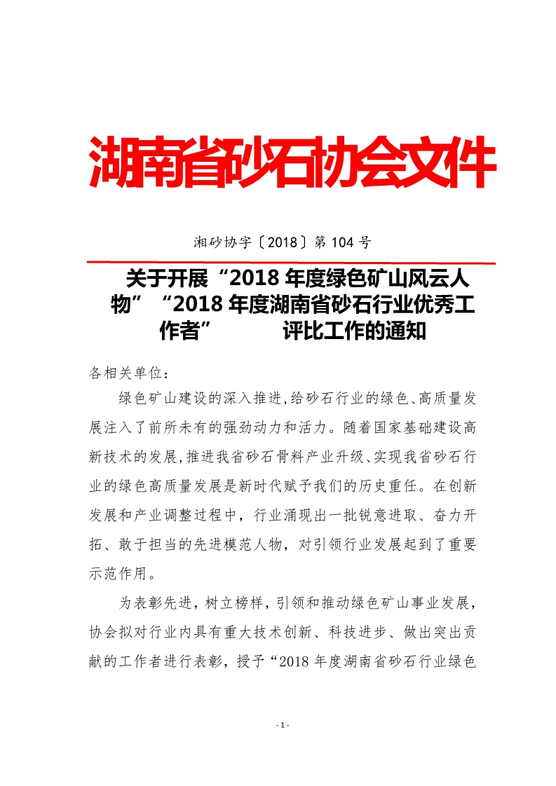 關于開展“2018年度綠色礦山風云人物”“2018年度湖南省砂石行業優秀工作者” 評比工作的通知 發布日期:2018-10-23 08:10:42 點擊量:1 標簽:通知公告 下載:風云人物-推薦表 優秀工作者-推薦表