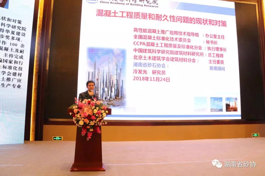 中國建筑科學研究院建筑材料研究所總工程師、高性能混凝土推廣應用技術指導組辦公室主任、湖南省砂石協會冷發光先生作了《混凝土工程質量和耐久性問題現狀和對策》的報告。冷總工從觸目驚心的質量問題、令人擔心的耐久性問題、造成質量和耐久性問題的主要原因、解決質量和耐久性問題的措施建議、推廣應用當代的高性能混凝土五大方面進行了解讀。