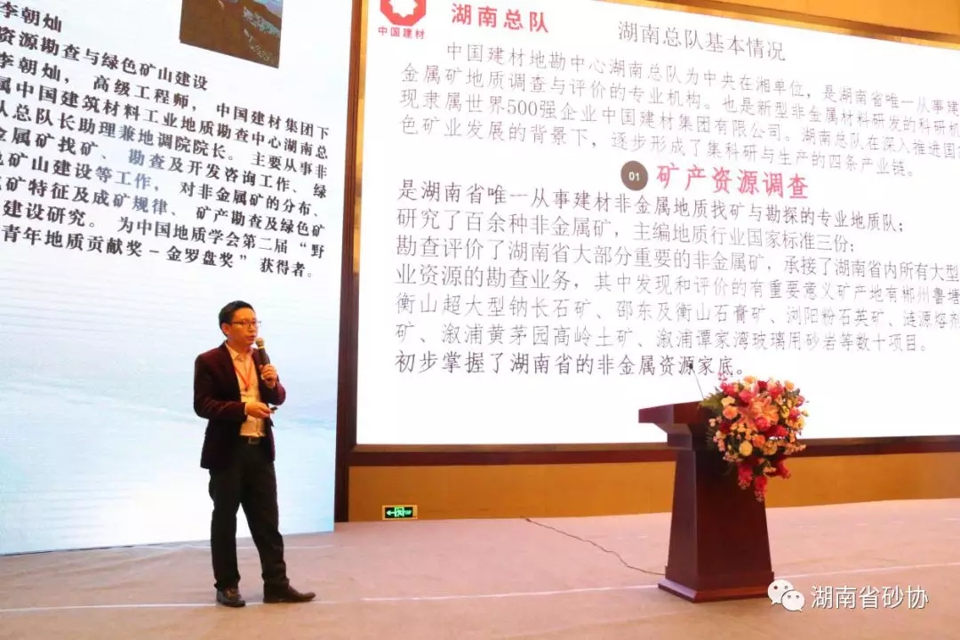 中國建筑材料工業地質勘查中心湖南總隊地調院院長李朝燦作了《砂石骨料行業資源勘查與綠色礦山建設》的報告。李院長從湖南省綠色礦山建設政策最新進展、資源在綠色礦山建設中的重要作用、資源勘查的基本要求、骨料投資評價中應注意的問題四大方面進行了解讀。