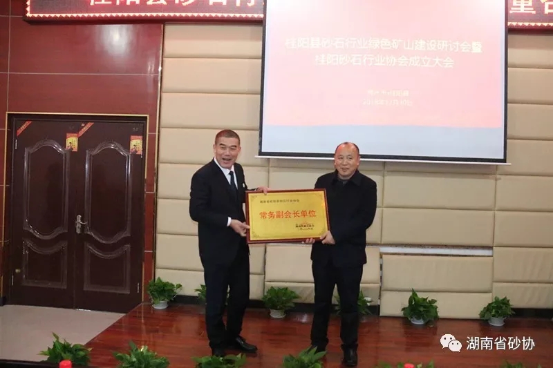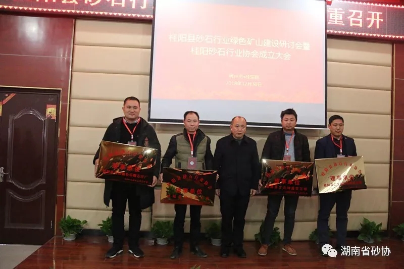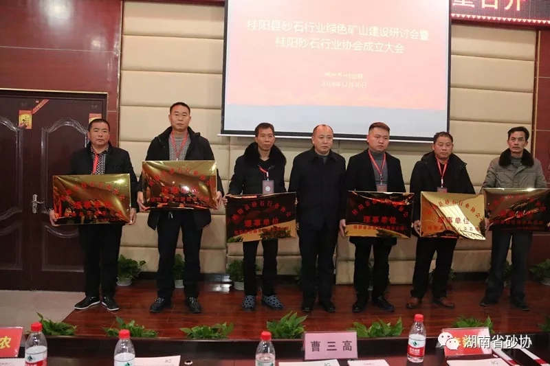 同時桂陽縣砂石協會會長曹三高授予本協會各會員單位牌匾并合影留念。
