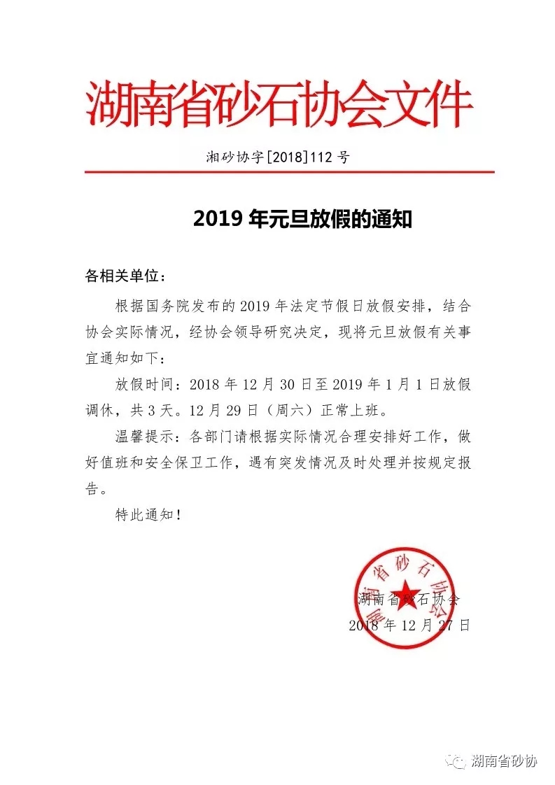 2019年湖南省砂石協會元旦節放假通知 發布日期:2019-01-02 08:08:27 點擊量:1 標簽:通知公告 元旦之際,湖南省砂石協會全體員工在這里祝大家元旦快樂!心想事成!在過去的一年里,你們的陪伴、支持、鼓勵、批評,我們都倍感珍惜!與你們相見,是我們成長的最大動力。在這里,真誠地對大家說一聲“謝謝”!2019,我們會懷著感恩,攜手前行!文字編輯/聶云川圖文校對/歐陽瓊責任編輯/李欣桐
