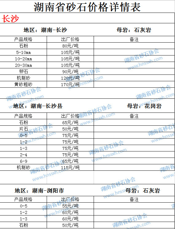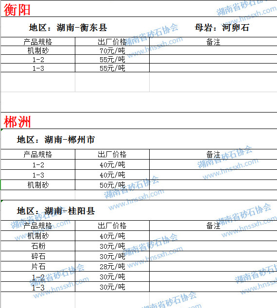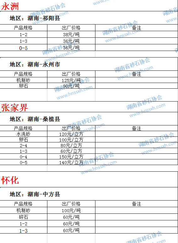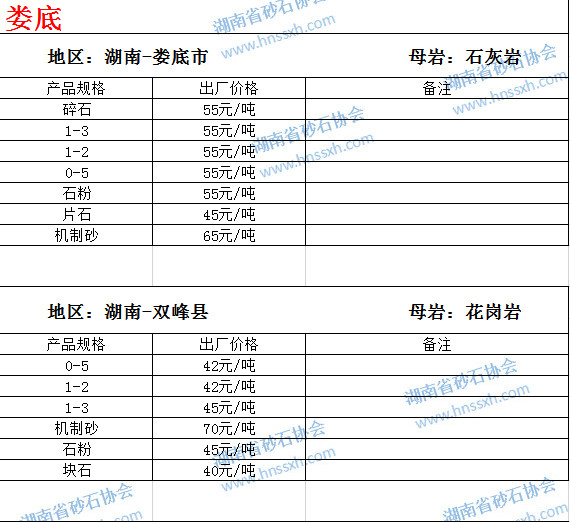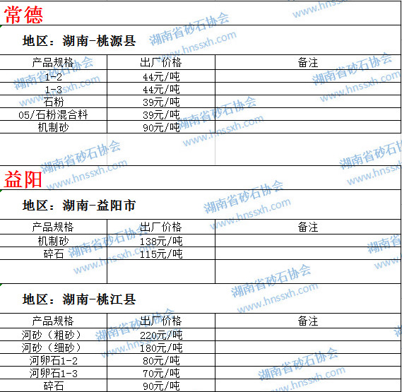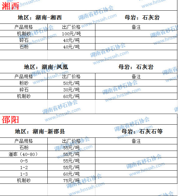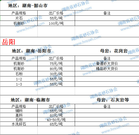 報價| 2019年1月湖南省各地州市砂石骨料產品在線報價信息