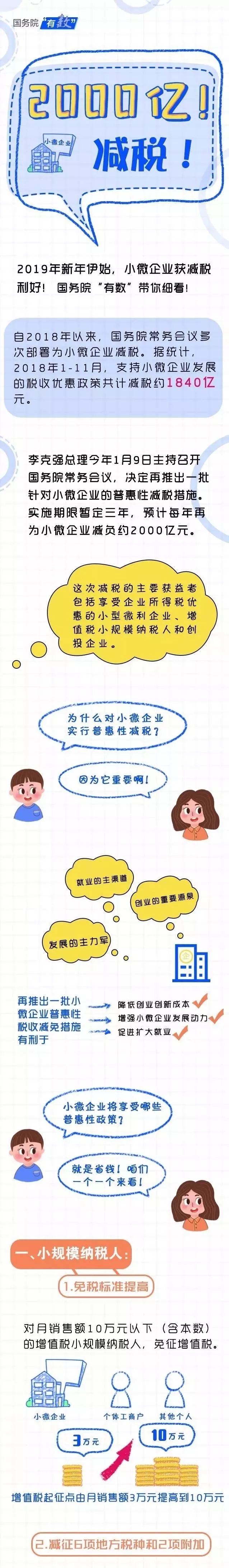 2019年1月9日,國務院常務會議決定再推出一批針對小微企業的普惠性減稅措施,實施期限暫定三年,預計每年可再為小微企業減負約2000億元。